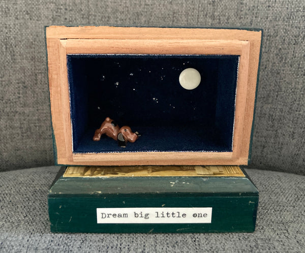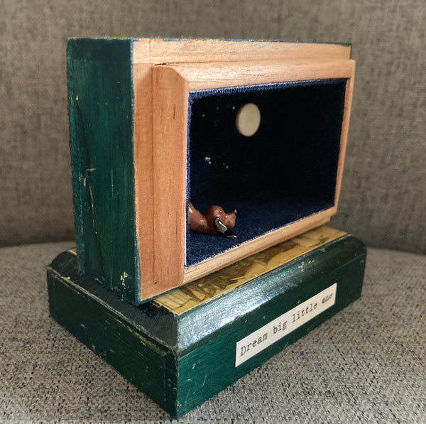 Vintage wooden box which has been attached to the lid to form a stand. Lined with blue velvet fabric and decorated with little ceramic dog.